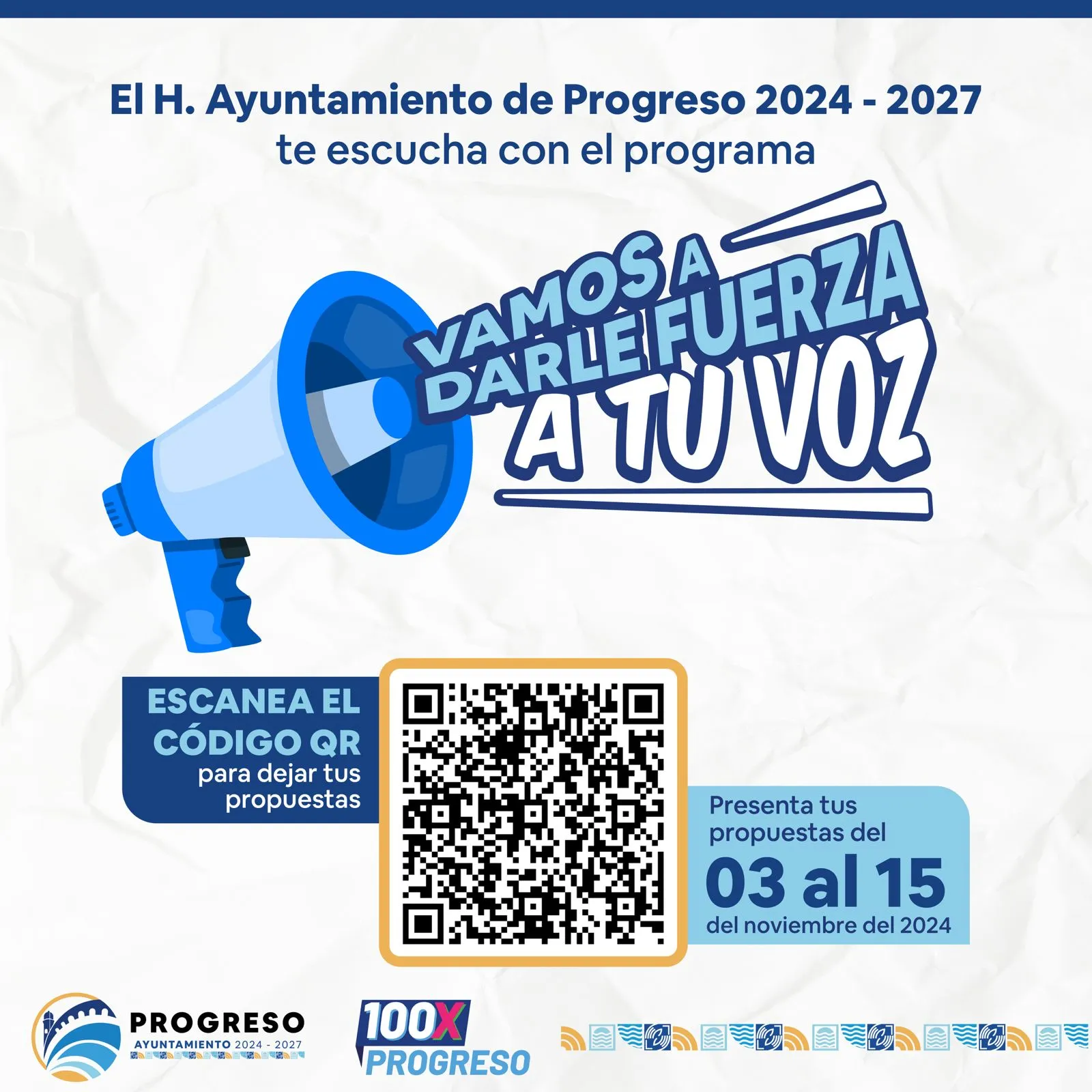 Aunado a ello, los interesados también pueden participar en “Vamos a darle fuerza a tu voz” mediante el llenado de una sencilla encuesta utilizando el código QR proporcionado en días anteriores en redes sociales del Ayuntamiento de Progreso asi como en espacios públicos concurridos.