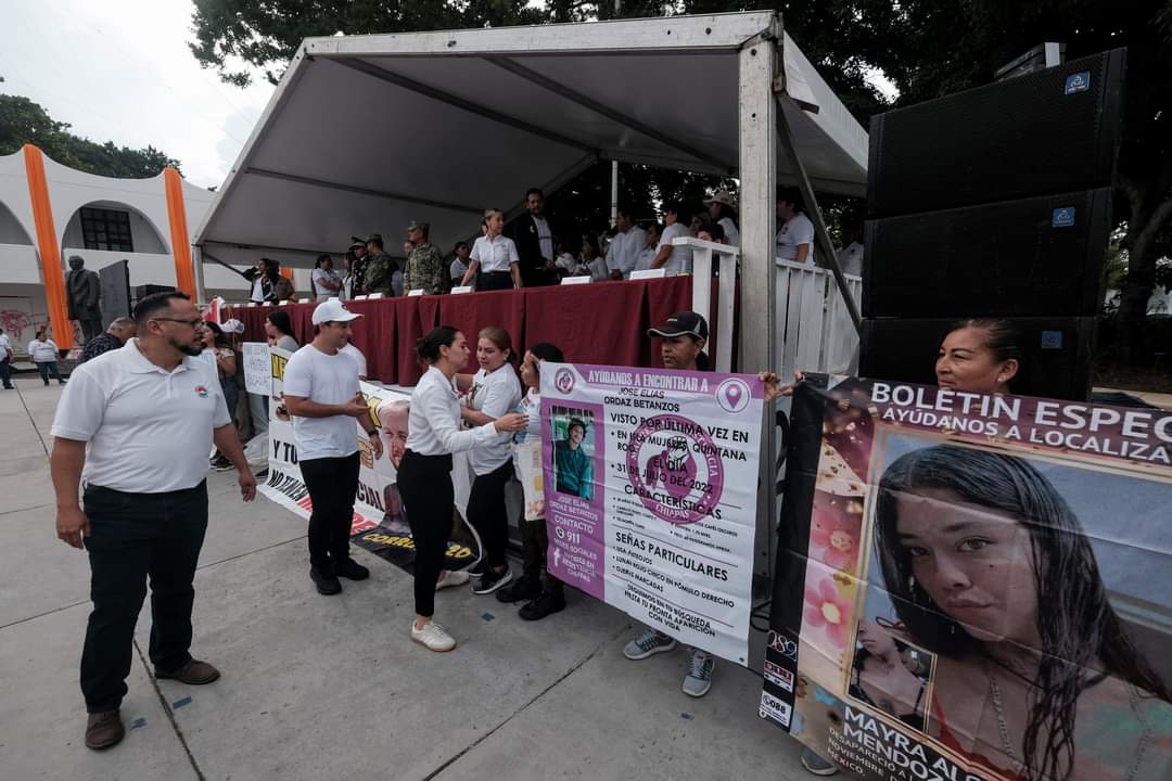 A las 8 horas, hora en que inició el desfile en el que, según estimaciones de autoridades municipal participaron unas 10 mil personas, un grupo de madres buscadoras junto con demandantes de justicia en otros temas, llegaron a la avenida Tulum, frente al Palacio Municipal, para instalarse frente al templete en que autoridades municipales, encabezadas por la alcaldesa Ana Patricia Peralta de la Peña, presenciaban el desfile de trabajadores, estudiantes y cuerpos de seguridad.