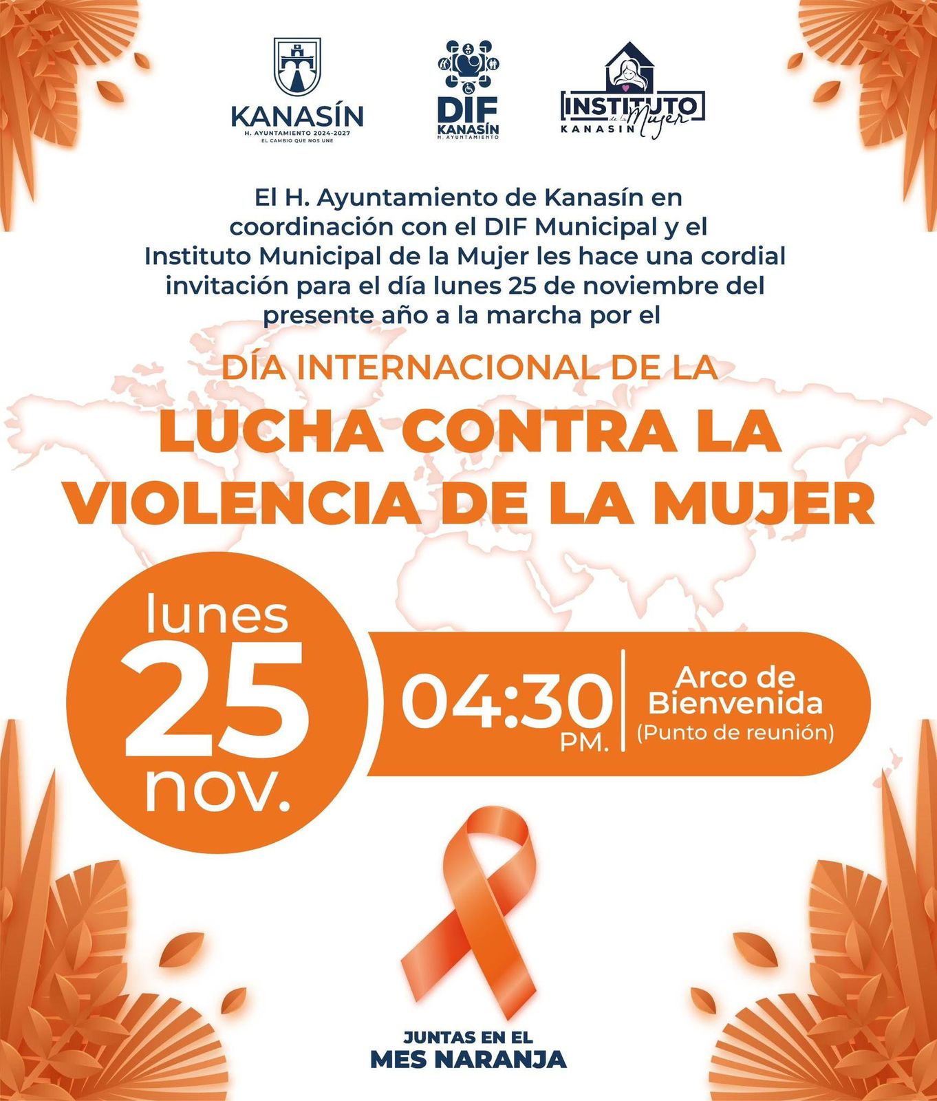 El DIF de Kanasín, en conjunto con el H. Ayuntamiento y el Instituto Municipal de la Mujer, invita a la comunidad a unirse a la marcha por el Día Internacional de la Lucha Contra la Violencia de la Mujer.