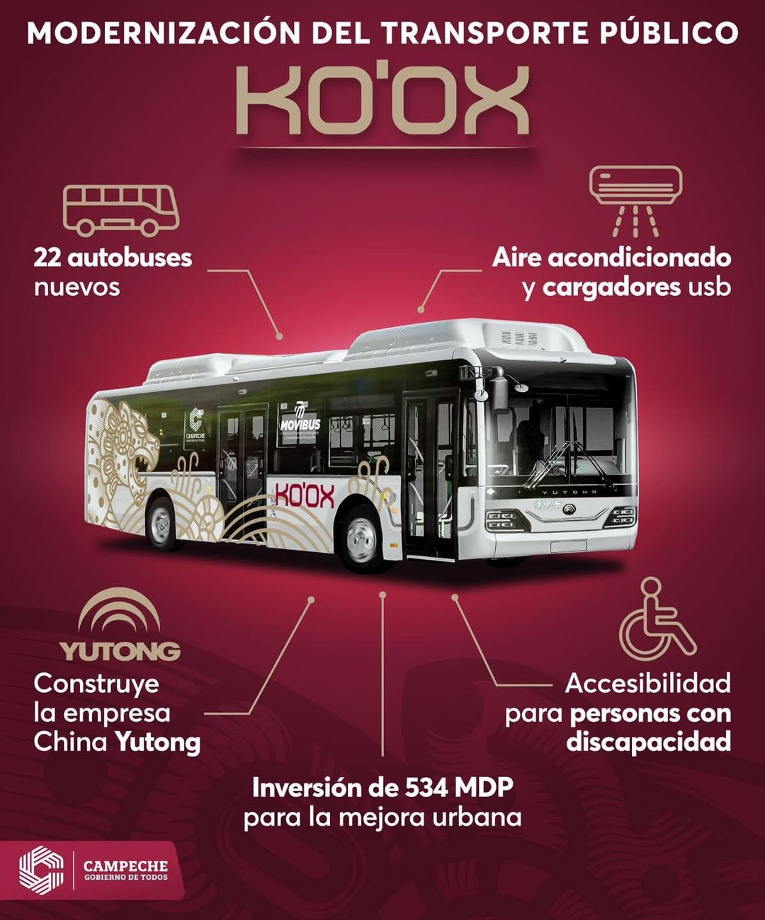 Las 22 nuevas unidades de transporte público llamadas Ko’ox administrado por Movibus que va estar llegando en el transcurso de este mes, pero que van estar exhibidos por 15 días para los campechanos, así como estuvo el tren ligero en el Centro de Convenciones.