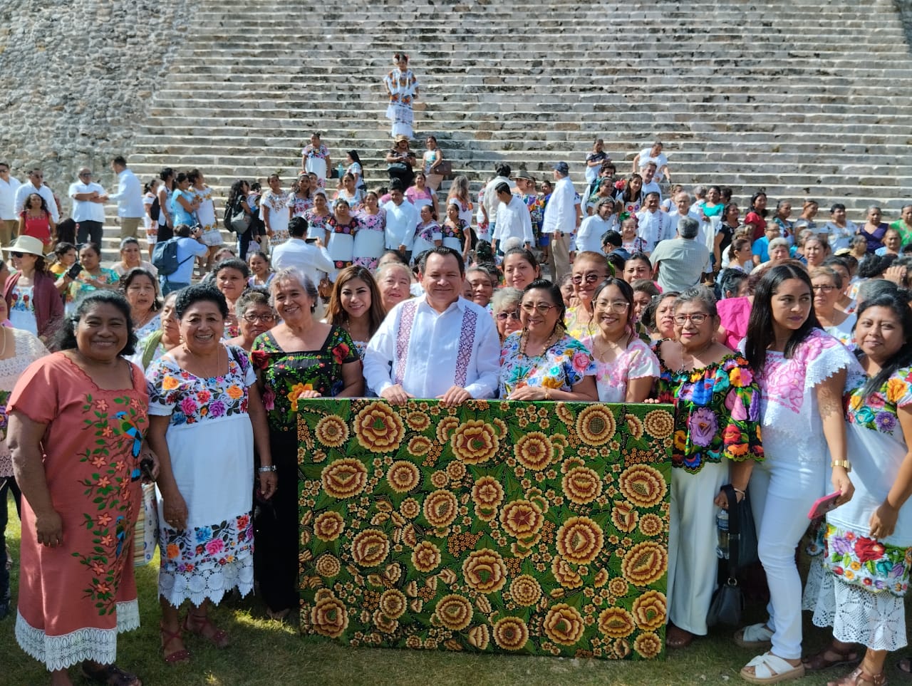 Al final del acto, el Gobernador de Yucatán recibió un presente por parte de las bordadoras, quienes se tomaron una foto juntos en los primeros escalones de la Pirámide del Adivino.