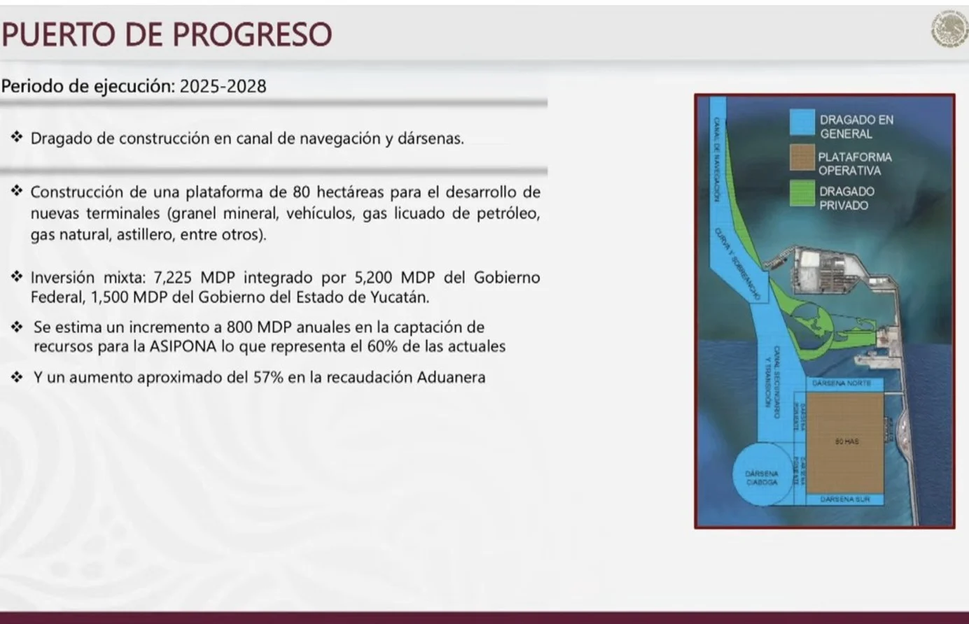 En Puerto Progreso, Yucatán, se realizará la construcción de una plataforma de 80 hectáreas para el desarrollo de nuevas terminales (granel mineral, vehículos, gas licuado de petróleo, gas natural, astillero, entre otros) y tendrá una inversión mixta de 7 mil 225 millones de pesos, integrado por 5 mil 200 millones de pesos del gobierno federal y mil 500 millones de pesos del gobierno de Yucatán.