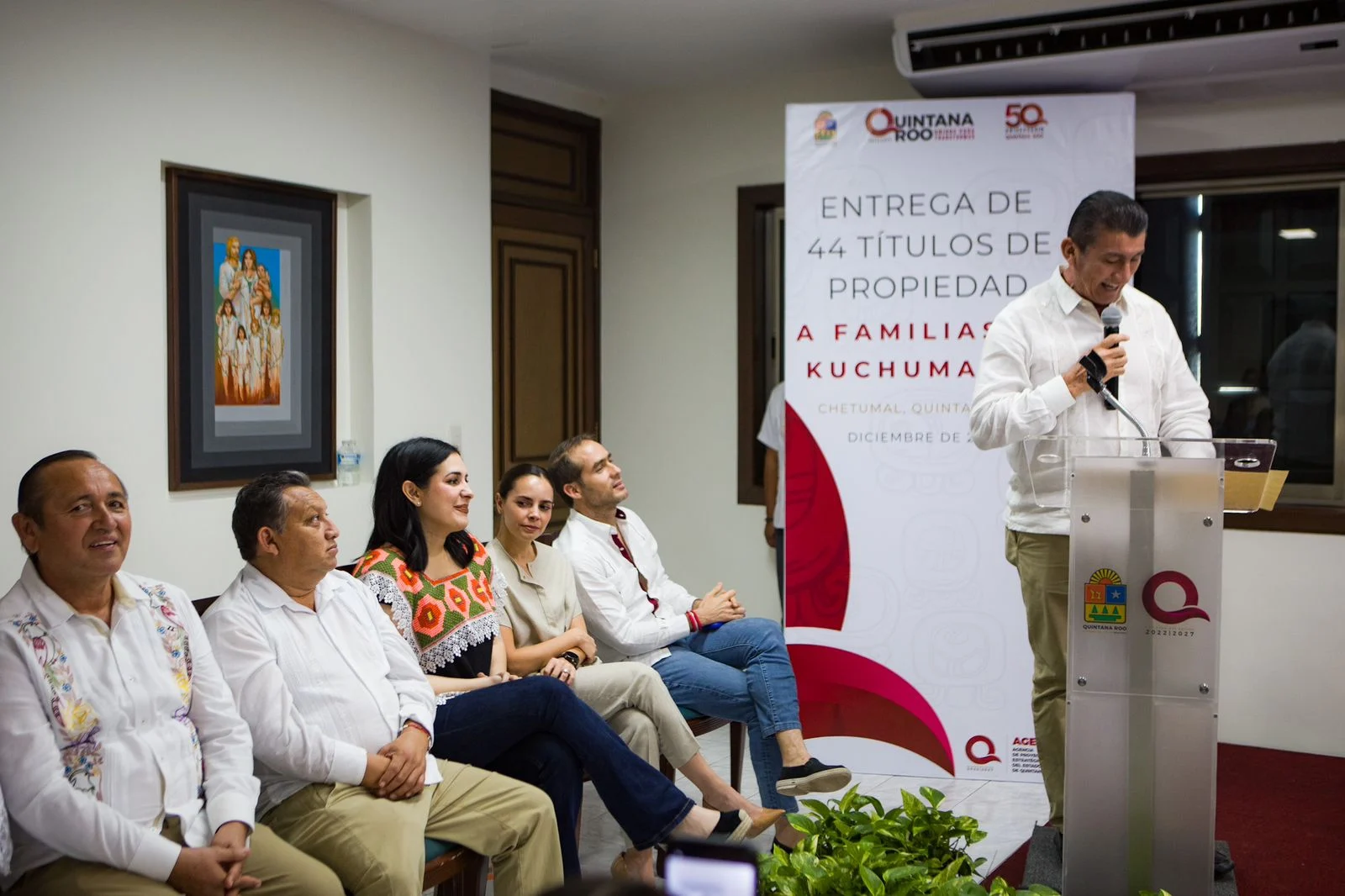 Se contó con la presencia de las y los presidentes de los 11 municipios del estado, y José Alfredo Chepe Contreras, alcalde de Bacalar, agradeció las gestiones de la gobernadora para el trámite de estos títulos; se entregaron 44 escrituras.