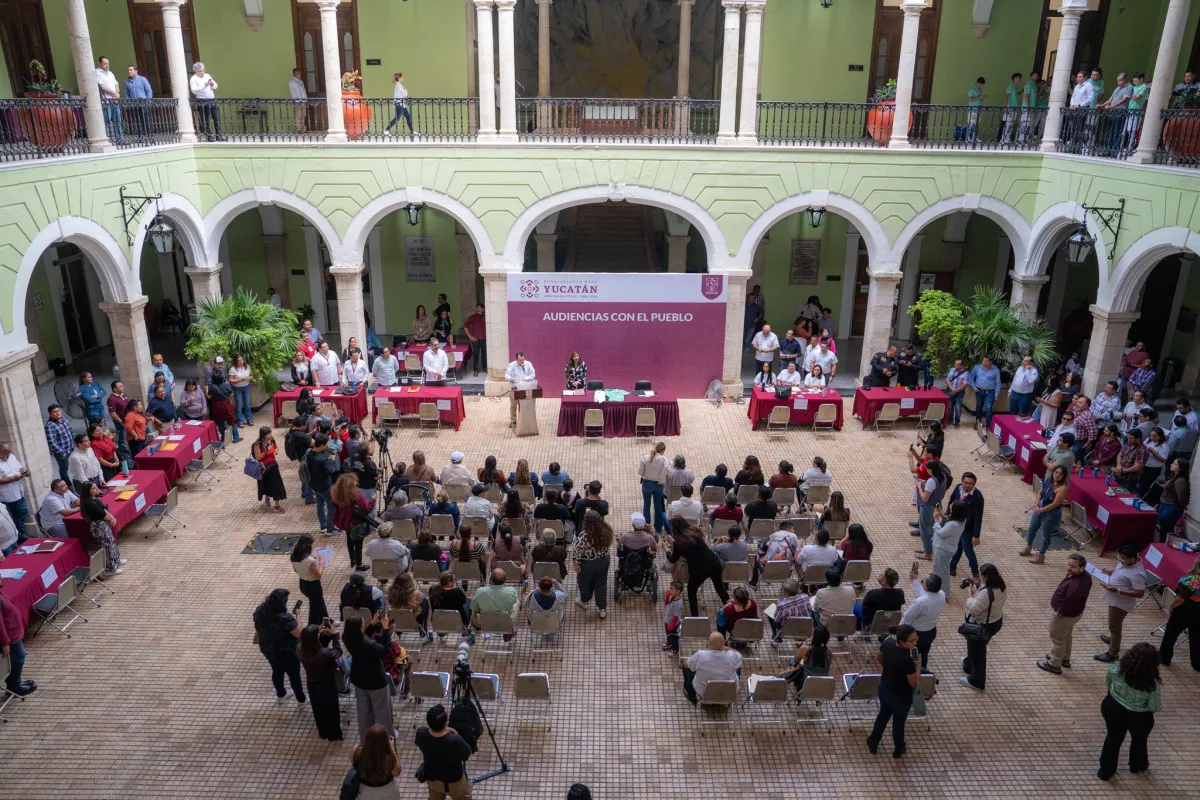 En el marco del cumplimiento de los primeros 100 días de su administración, el mandatario estatal y la presidenta honoraria del DIF Yucatán se instalaron en el patio central de la sede del Ejecutivo, junto con los titulares de las dependencias de la administración estatal e instancias federales, para recibir personalmente a gente de todo el estado y escuchar sus requerimientos personales y los de sus comunidades, reiterando su compromiso de trabajar por y para el pueblo.