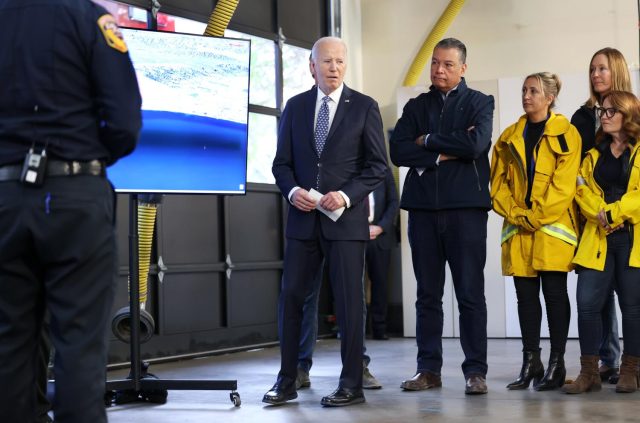 El anuncio del presidente pareció aterrizar torpemente en la sala. Biden acababa de recibir actualizaciones sobre el estado de los incendios de los principales funcionarios de seguridad pública de la región, que continúan siendo algunos de los más destructivos de Los Ángeles en la memoria reciente. El gobernador Gavin Newsom, el senador estadounidense Alex Padilla y media docena de otros funcionarios electos estatales y locales también estuvieron presentes en la sesión informativa.