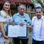 El profesor Roger Antonio Och Dzib, junto a dos de sus estudiantes de la escuela primaria bilingüe de la comunidad de Hidalgo y Cortés, presentó el audiolibro Juan T’u’ul yéetel J-Kooj (Juan conejo y el puma), un relato de 20 minutos de duración que utiliza en el aula para impartir la lengua maya de una manera interactiva y divertida para los infantes.