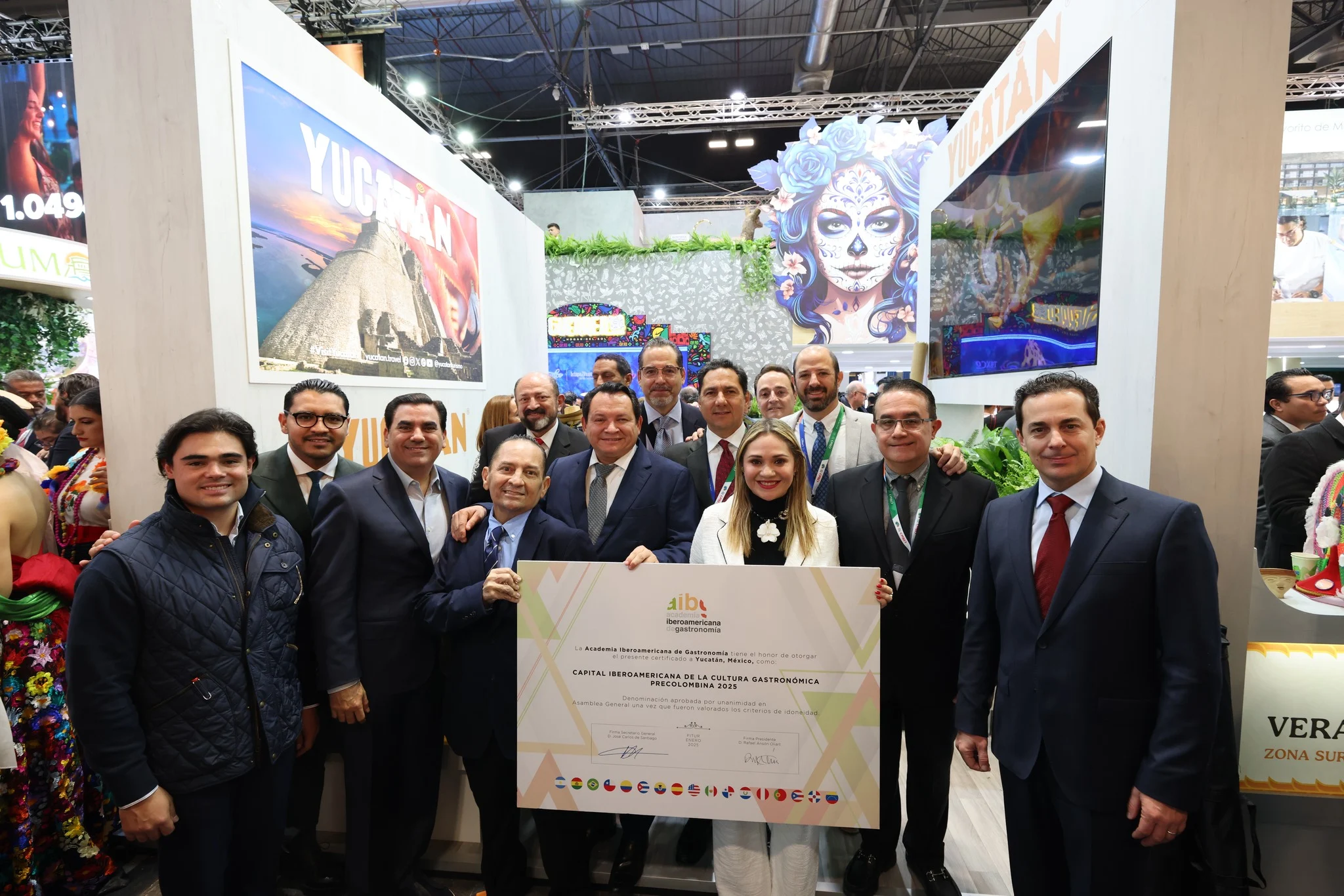 Acompañado de dirigentes de las cámaras empresariales, funcionarios estatales, líderes y empresarios del sector turístico yucateco, cortaron el listón inaugural de stand de Yucatán en la FITUR 2025.