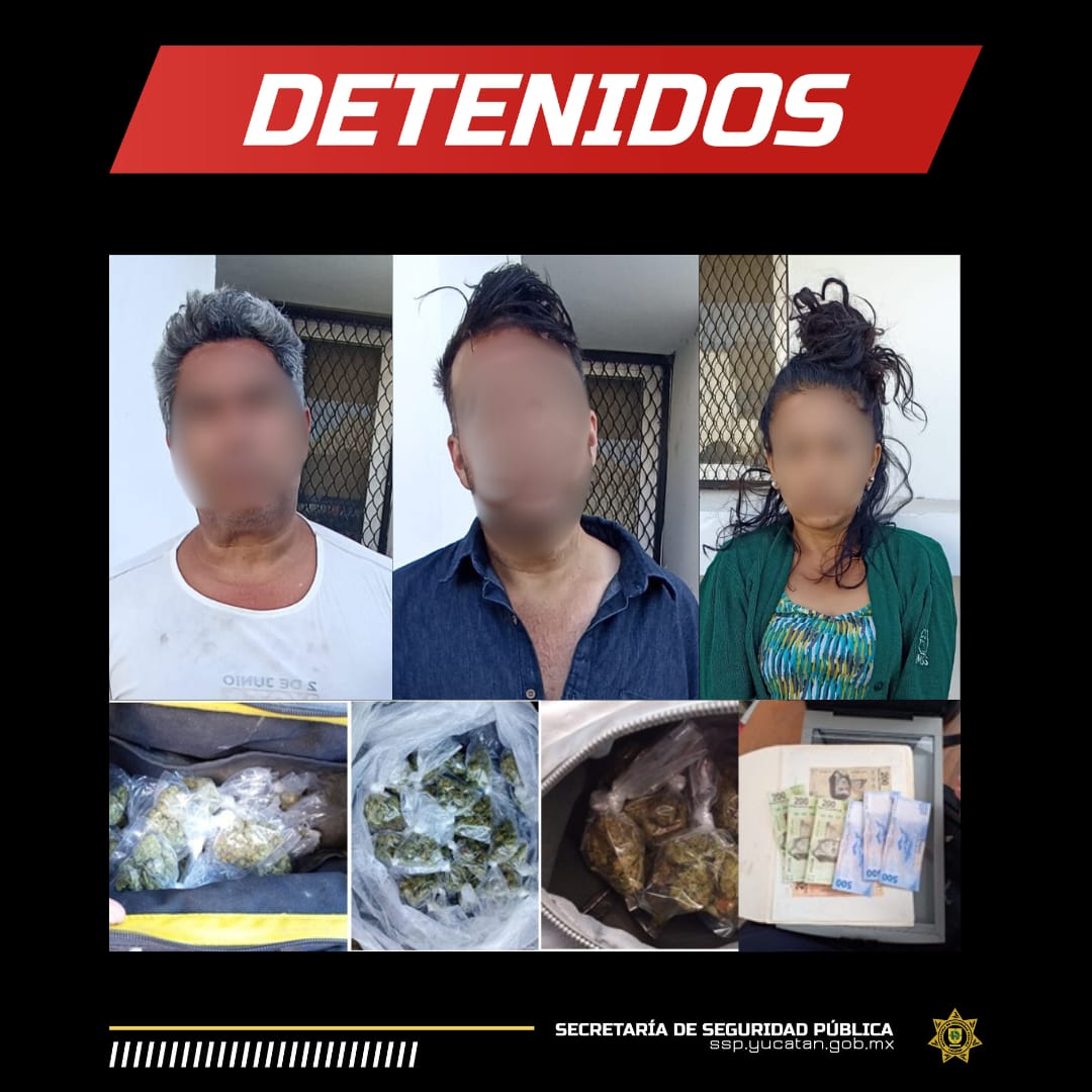 Elementos de la Secretaría de Seguridad Pública (SSP) detuvieron hoy al sur de Mérida a tres personas en posesión de cannabis y billetes apócrifos.