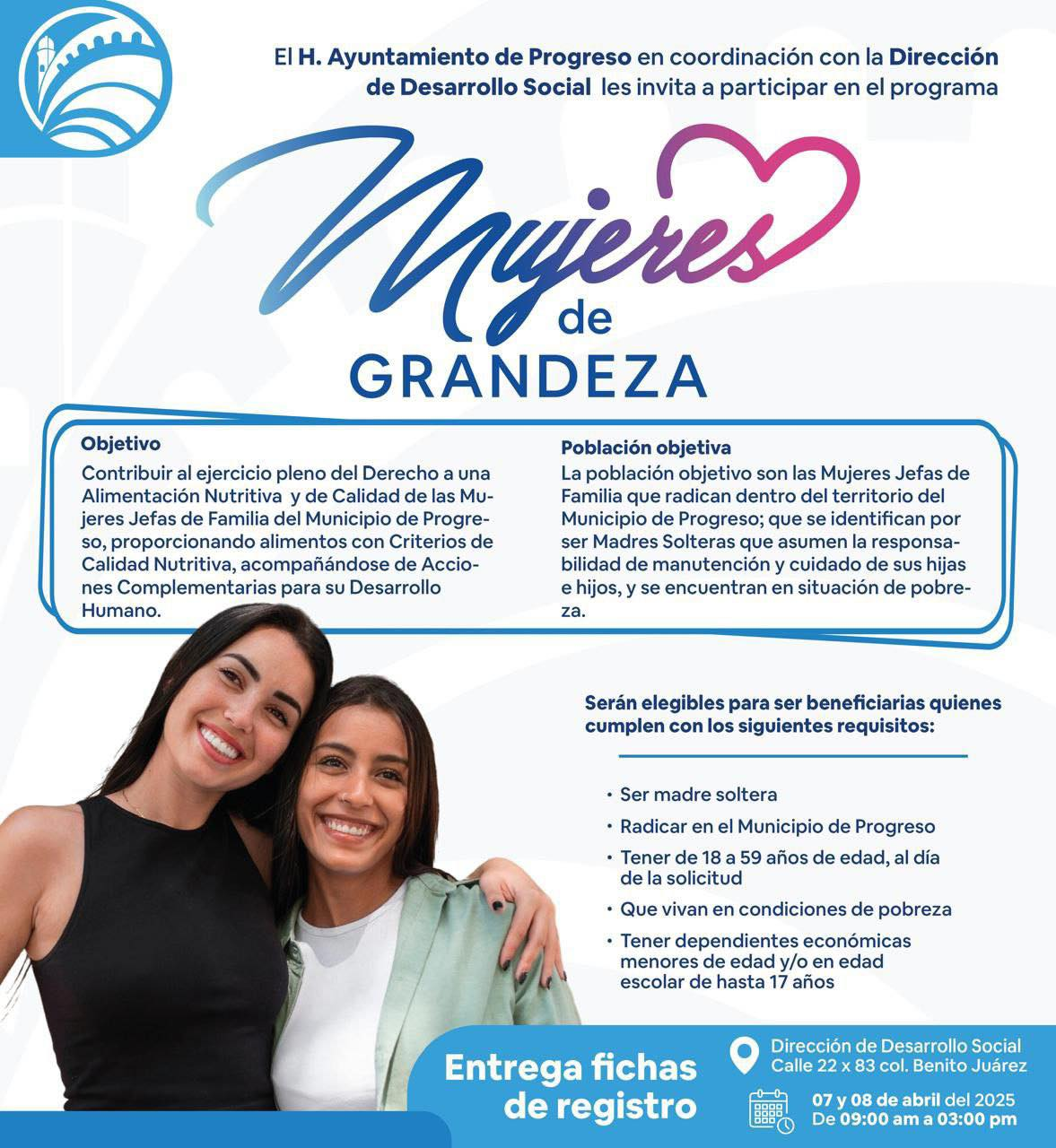 Con el objetivo de empoderar a las mujeres y combatir la inseguridad alimentaria en el municipio y sus seis comisarías, el Ayuntamiento de Progreso, a través de la Dirección de Desarrollo Social, pondrá en marcha a partir del lunes 7 de abril una nueva iniciativa de apoyo alimentario: “Mujeres de Grandeza”.