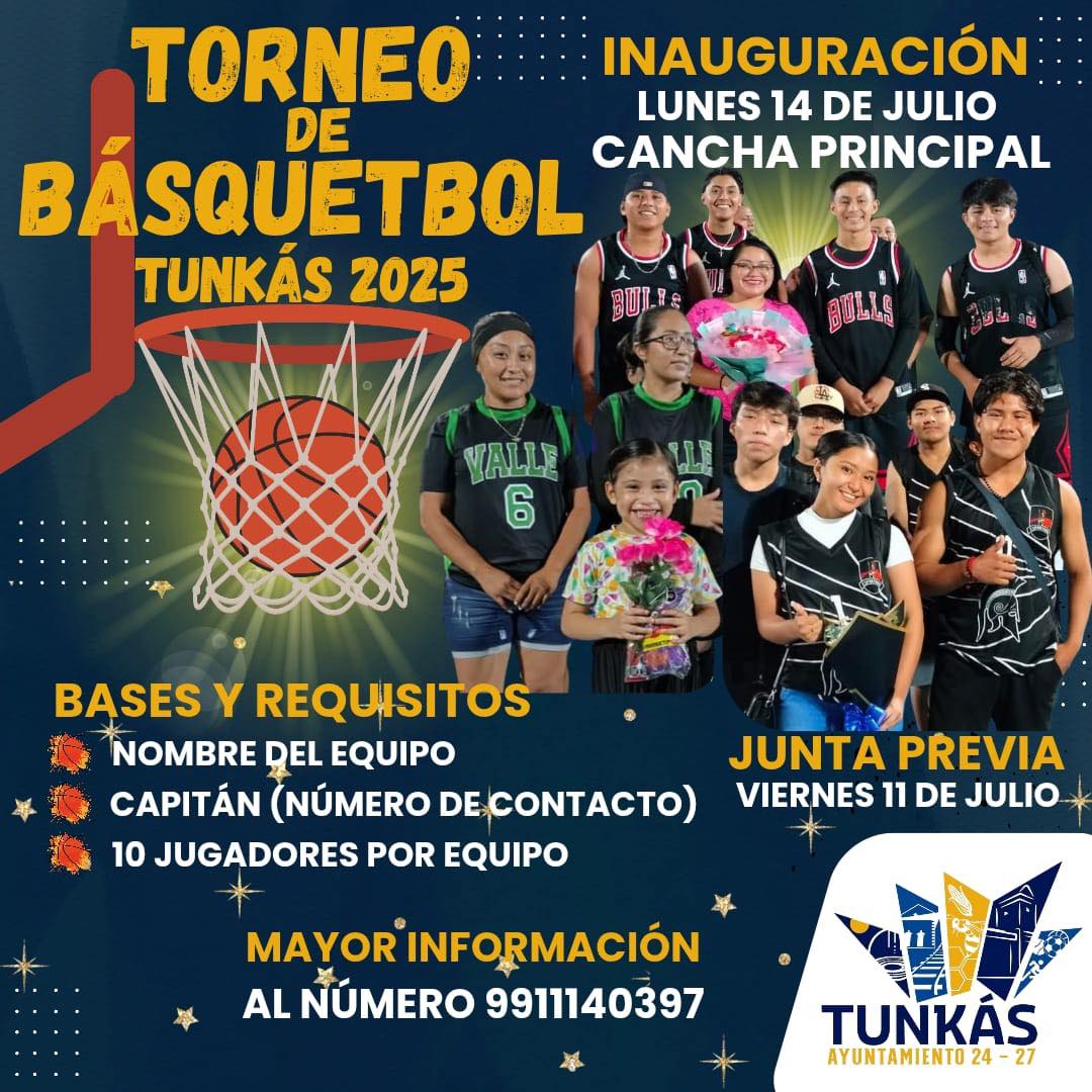 El Ayuntamiento de Tunkás, administración 2024-2027, a través de la Dirección Municipal de Deportes, se complace en anunciar el arranque del tradicional Torneo de Básquetbol Verano 2025, uno de los eventos deportivos más esperados por la comunidad, que fomenta el espíritu competitivo, la sana convivencia y la promoción del deporte ráfaga entre jóvenes y adultos del municipio y sus alrededores.