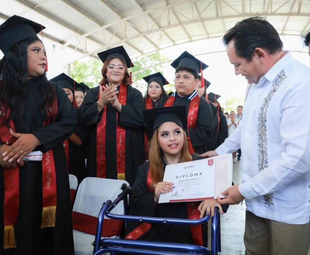 Durante el evento, en el que se entregaron certificados y diplomas a 95 jóvenes egresados, el mandatario estatal recordó que esta beca estatal está dirigida a estudiantes que no resultaron beneficiados por la convocatoria federal, por lo que su administración implementó este apoyo adicional, que se entregará mediante la tarjeta Felipe Carrillo Puerto.