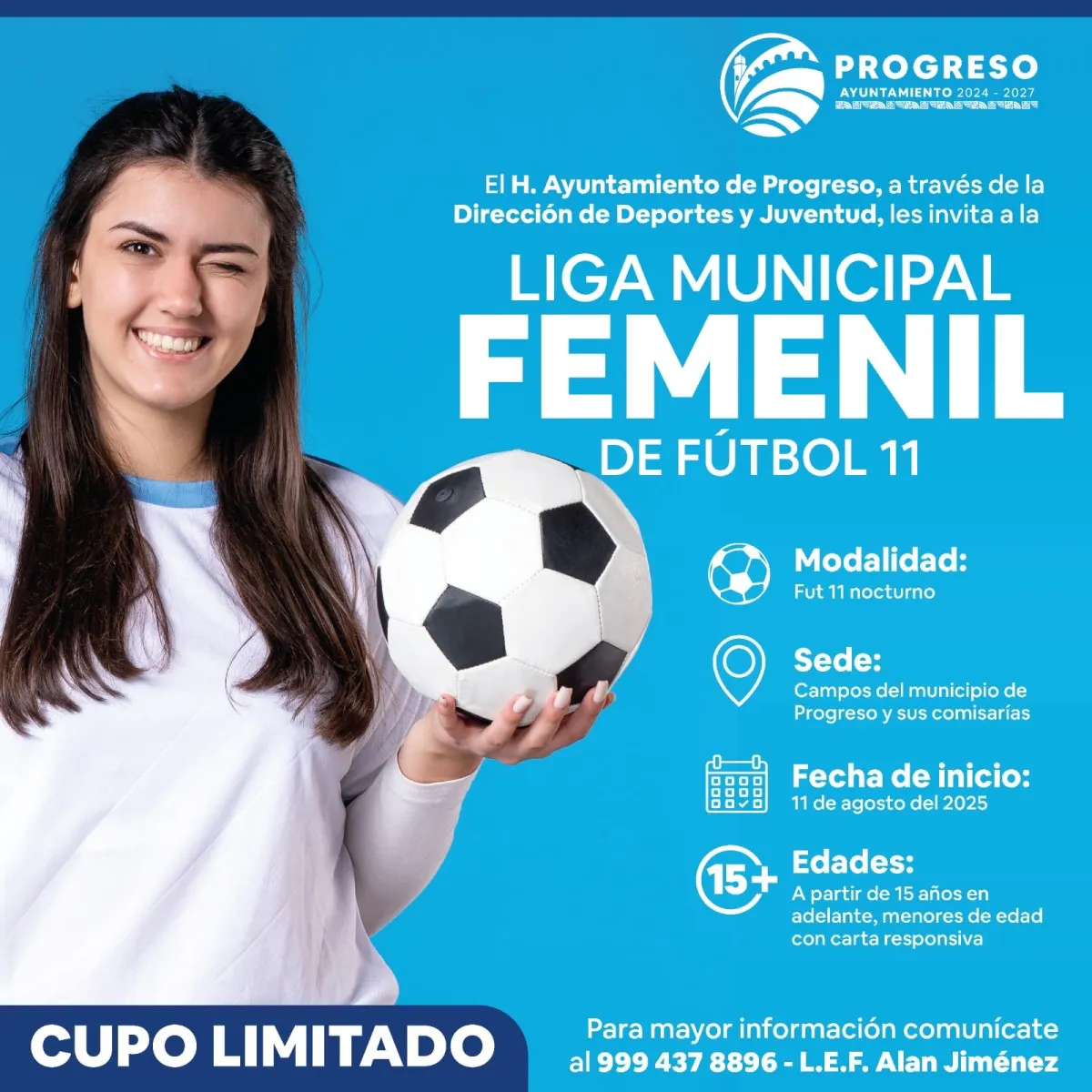 Por indicaciones del primer edil Erik Rihani González, la Dirección de Deportes y Juventud del Ayuntamiento de Progreso lanzó la convocatoria para que mujeres mayores de 15 años se inscriban en la próxima edición de la Liga Municipal Femenil de Fútbol 11, que dará inicio el lunes 11 de agosto.