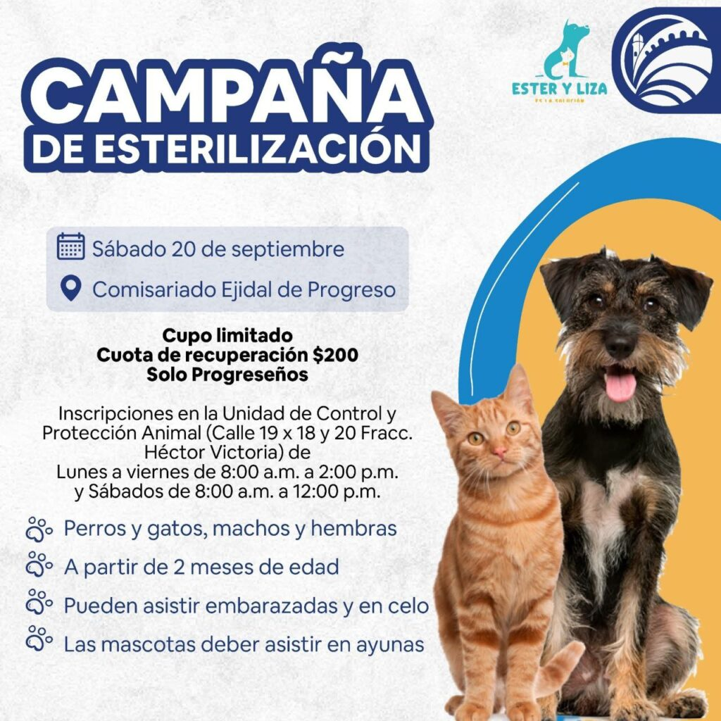 Con el objetivo de fomentar el bienestar de las mascotas, el alcalde Erik Rihani, a través de la Unidad de Protección y Control Animal en coordinación con la Dirección de Pesca, invita a participar en la Campaña de Esterilización Canina y Felina a bajo costo, que se llevará a cabo el sábado 20 de septiembre.