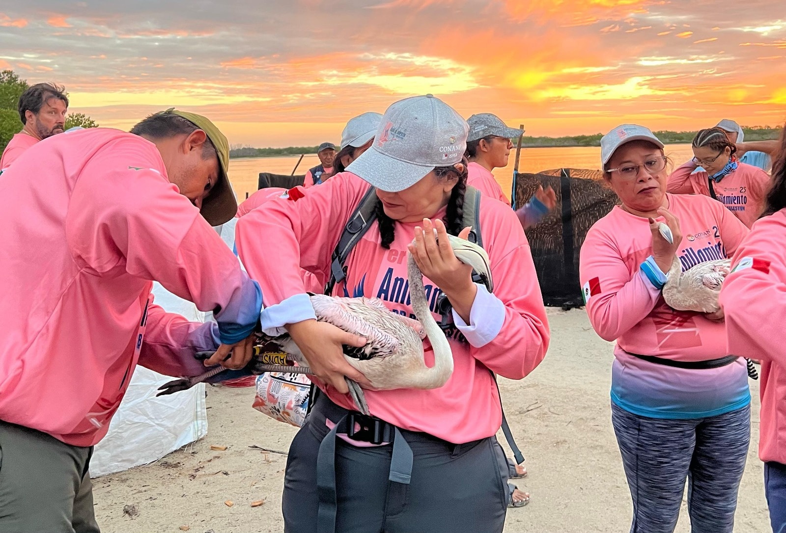_En coordinación con la Conanp, se realizaron jornadas de anillamiento en Ría Lagartos y Ría Celestún, acción que permitirá reforzar el monitoreo y la protección de esta especie emblemática