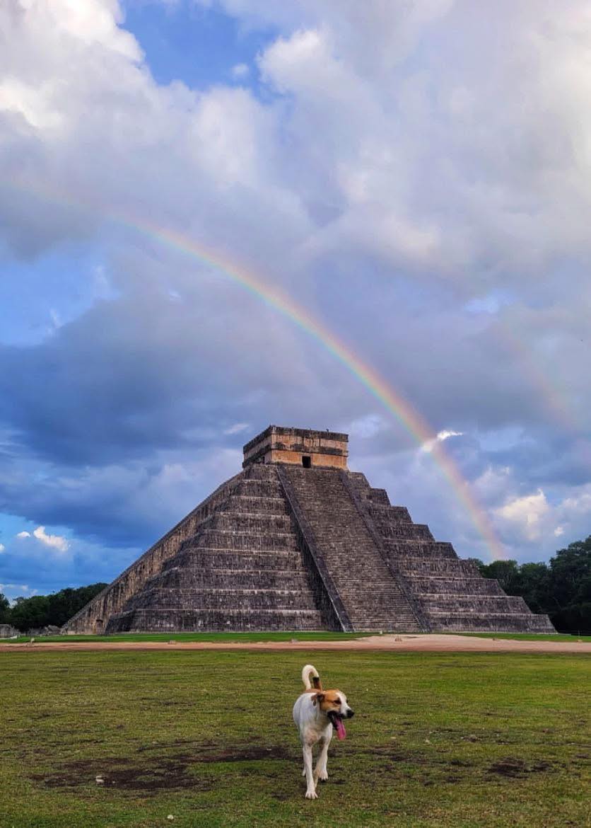 La postal del arcoíris sobre Kukulkán junto a estos caninos es más que una simple coincidencia: es un recordatorio de cómo la naturaleza, la historia y la vida cotidiana se entrelazan en un mismo lugar. Un instante mágico que une la fuerza de los dioses mayas con la sencillez y nobleza de dos perritos que ya forman parte del corazón de Yucatán.