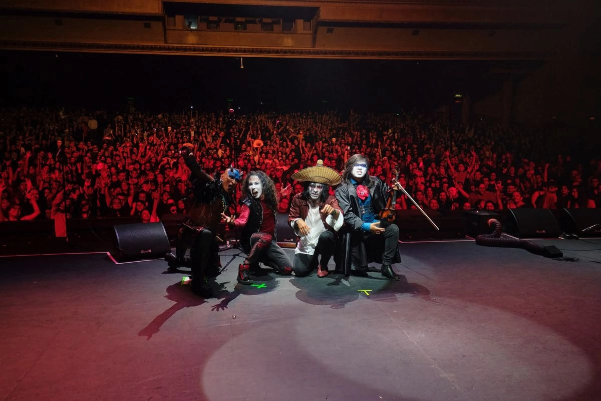 A las afueras del teatro, se vendieron sombreros de bejuco, utilizados por los “huehuentones” durante el Día de Muertos, además de máscaras blancas, objetos que la misma banda usa en sus videos y presentaciones.