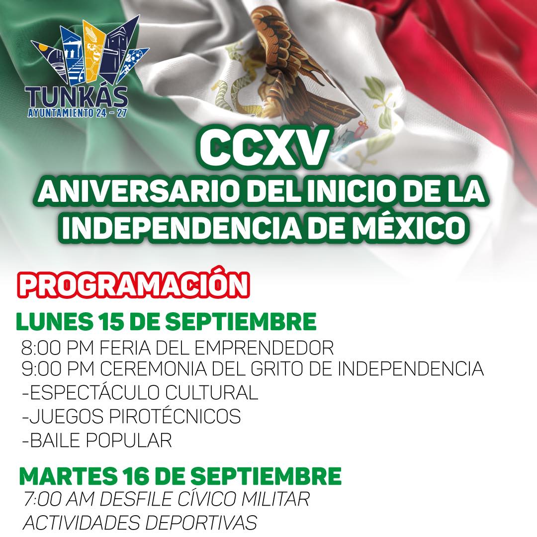El Ayuntamiento de Tunkás, presidido por el alcalde Jorge Kuh, anunció un programa especial de actividades para conmemorar el CCXV aniversario del inicio de la Independencia de México, con el objetivo de fortalecer la identidad nacional y fomentar la convivencia familiar en la comunidad.