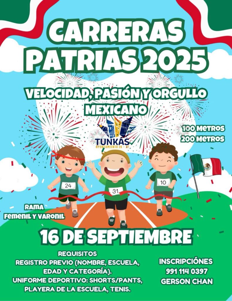 Asimismo, el Ayuntamiento de Tunkás, a través de la Dirección de Deportes, convoca a la comunidad a participar en las Carreras Patrias 2025, que se llevarán a cabo el mismo 16 de septiembre. Las competencias estarán abiertas en las ramas varonil y femenil, con pruebas de 100 y 200 metros planos.