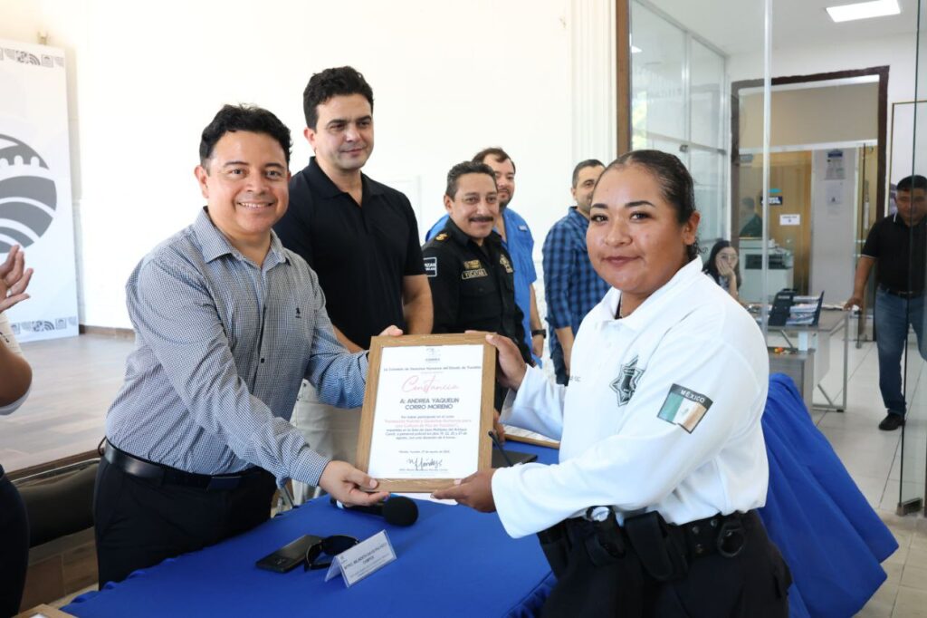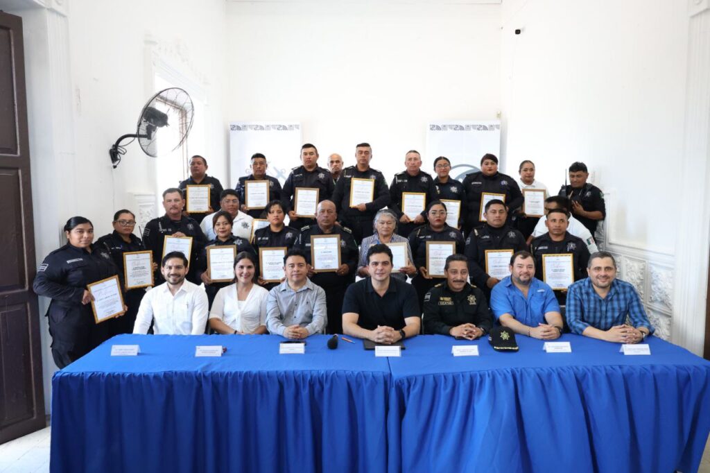 Esta tarde, el alcalde Erik Rihani González entregó reconocimientos a más de 40 elementos de la Dirección de Seguridad Pública y Tránsito (DSPT) de Progreso, quienes concluyeron el curso “Formación Policial y Derechos Humanos”, impartido por la Comisión de Derechos Humanos del Estado de Yucatán (CODHEY). El objetivo de esta capacitación fue fortalecer una actuación policial más profesional, ética y respetuosa con la ciudadanía.