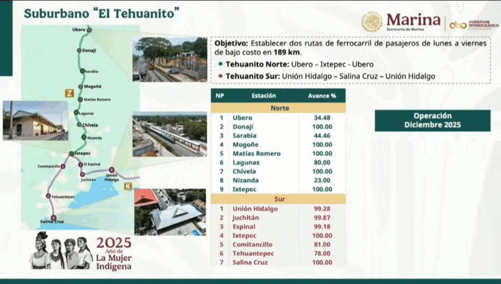 El tren de pasajeros suburbano “El Tehuanito” entrará en operación en diciembre con dos rutas de bajo costo para la población de bajos recursos, como parte del Corredor Interoceánico, mientras continúan los trabajos para conectarlo con la red ferroviaria nacional y con Guatemala, informó el director general del Corredor Interoceánico del Istmo de Tehuantepec, vicealmirante Octavio Sánchez.