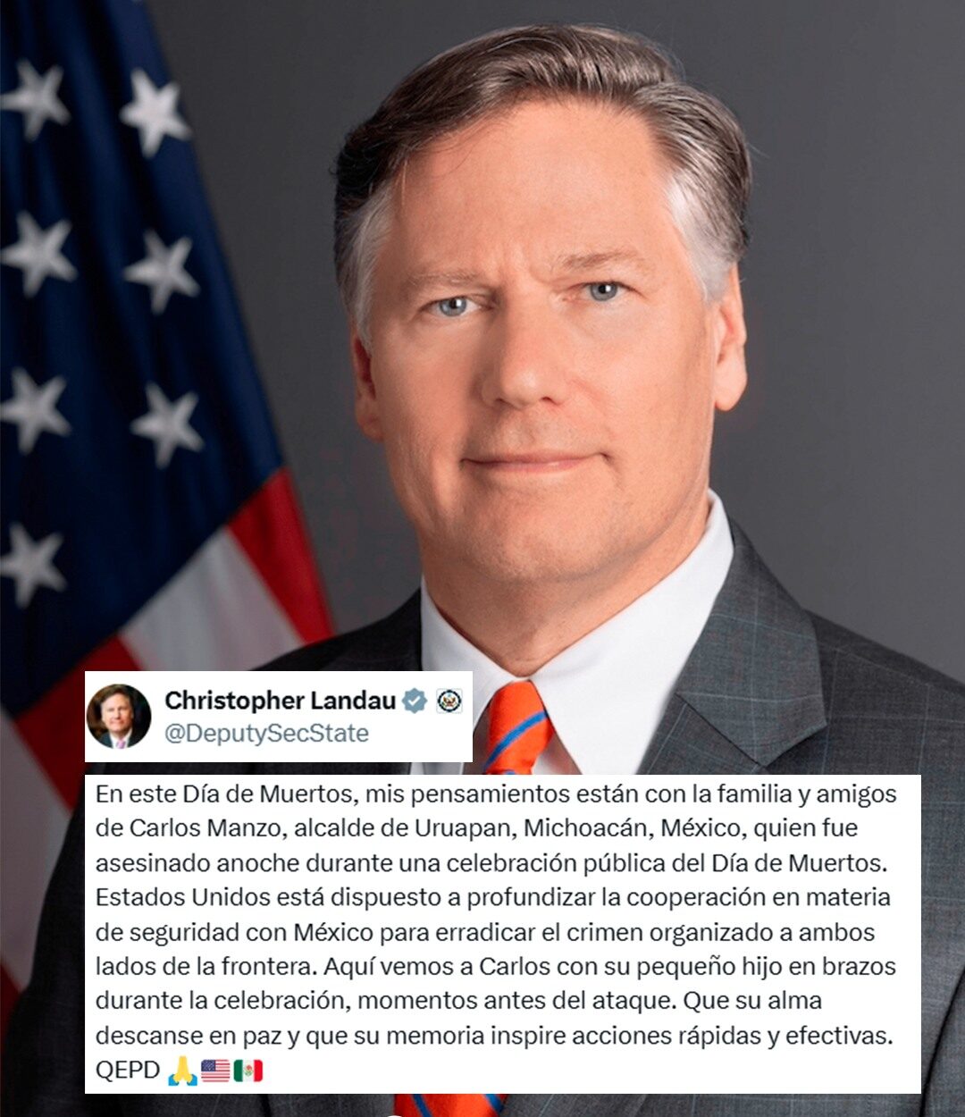 Tras el trágico asesinato del alcalde de Uruapan, Carlos Manzo, el subsecretario de Estado de Estados Unidos, Christopher Landau, expresó sus más sinceras condolencias a la familia del funcionario y al pueblo mexicano, al tiempo que reiteró la disposición de su país para apoyar a México en materia de seguridad y combate al crimen organizado.