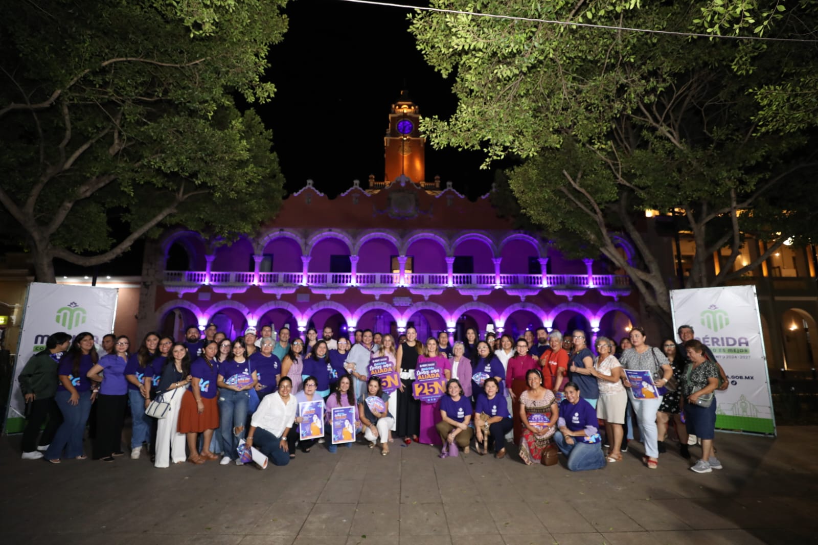 Posteriormente, el funcionariado e invitados acompañaron a la alcaldesa en la iluminación de Palacio Municipal con el color morado, en conmemoración del 25N que es el Día Internacional de la Eliminación de la Violencia contra las Mujeres.