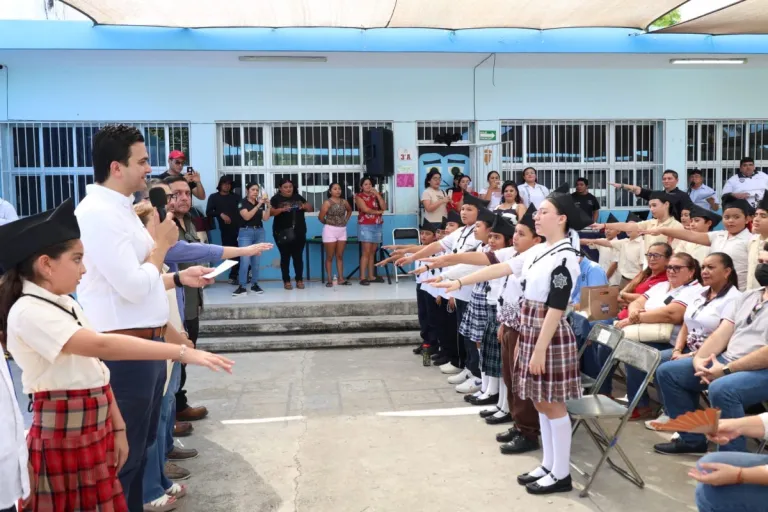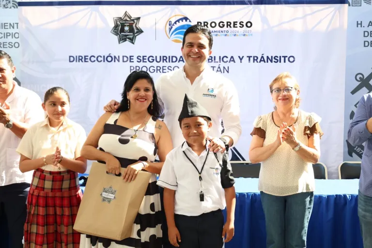 El alcalde Erik Rihani González encabezó en la primaria Ismael García la toma de protesta de más de 50 nuevos Agentes Escolares, como parte de la segunda edición del programa “Educando con Seguridad”, impulsado por la Dirección de Seguridad Pública y Tránsito (DSPT) de Progreso.