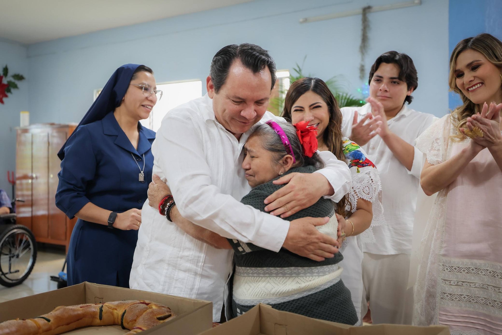 Antes de concluir su visita, Díaz Mena acudió a la Casa del Anciano “Los Tres Reyes”, donde conversó con las y los residentes y entregó 100 despensas y roscas de reyes para su disfrute.